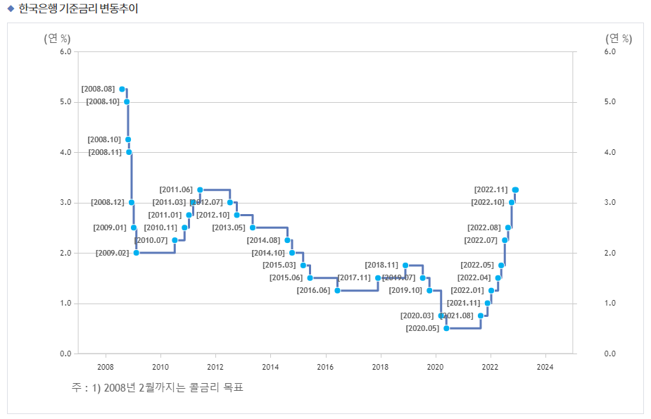 한국은행 기준금리 추이에서 볼수 있듯이. 2021년 하반기 부터 계속적으로 기준금리도 가파르게 상승하고 있네요.