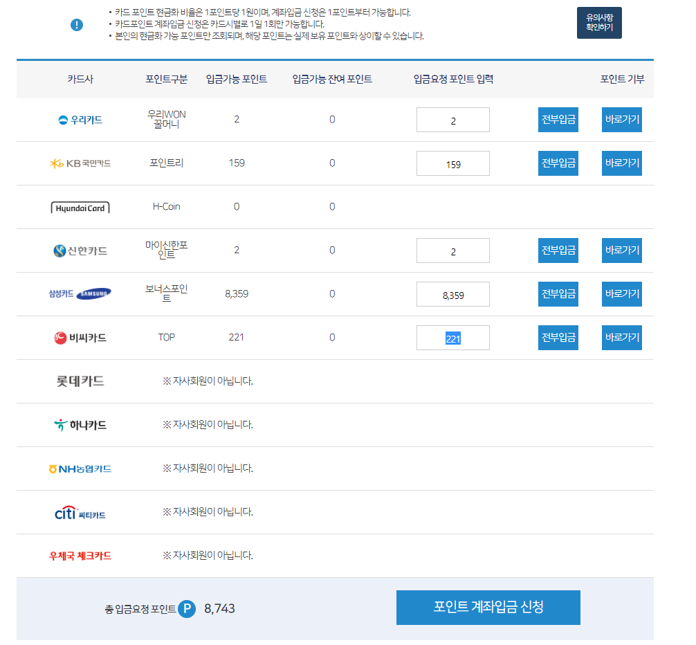 원하시는 카드사의 포인트 옆에 입금요청 포인트를 입력하시거나 전부를 원하시면 각 카드사별로 전부입금 버튼을 누르면 자동으로 입금요청 포인트에 입력이 됩니다.