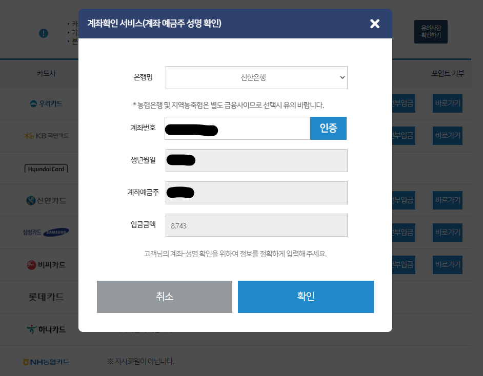 유의사항을 확인하셨다면 계좌확인 서비스를 거칩니다.