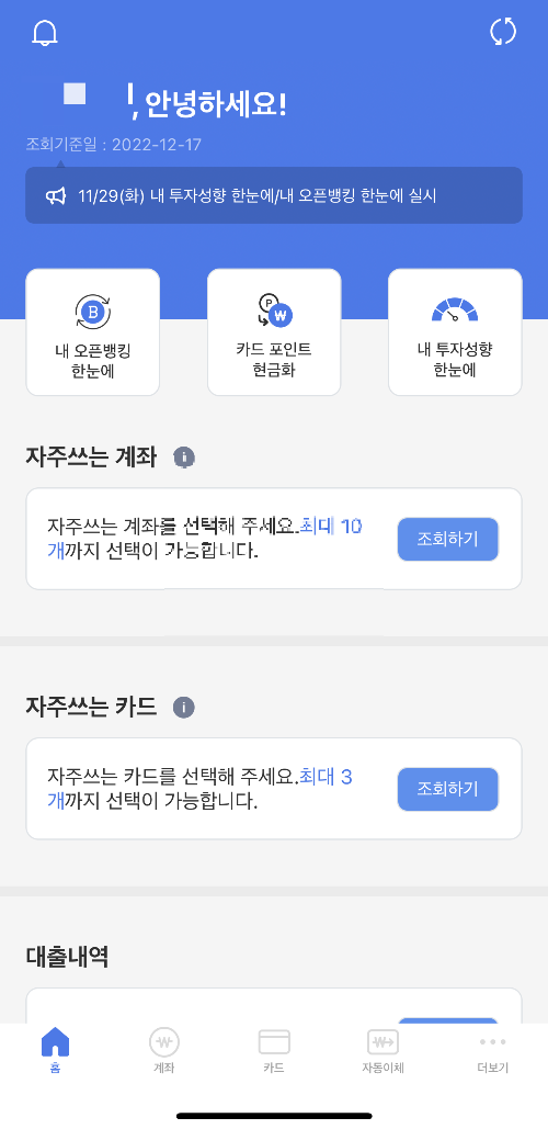카드포인트 조회 뿐만아니라 계좌, 카드/포인트, 보험/대출, 자동이체 등 금융정보를 한눈에 확인하고 관리할 수 있는 서비스등 계좌통합관리 서비스를 제공하기 때문에 다양한 유용한 서비스를 이용할 수 있어 설치할 것을 추천드립니다.앱 설치하기