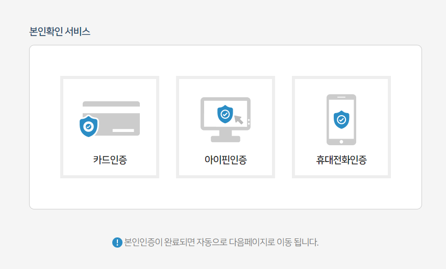 카드인증, 아이핀인증, 휴대전화인증 이렇게 3가지 방법이 있으니 편하신 방법을 선택하시면 됩니다.