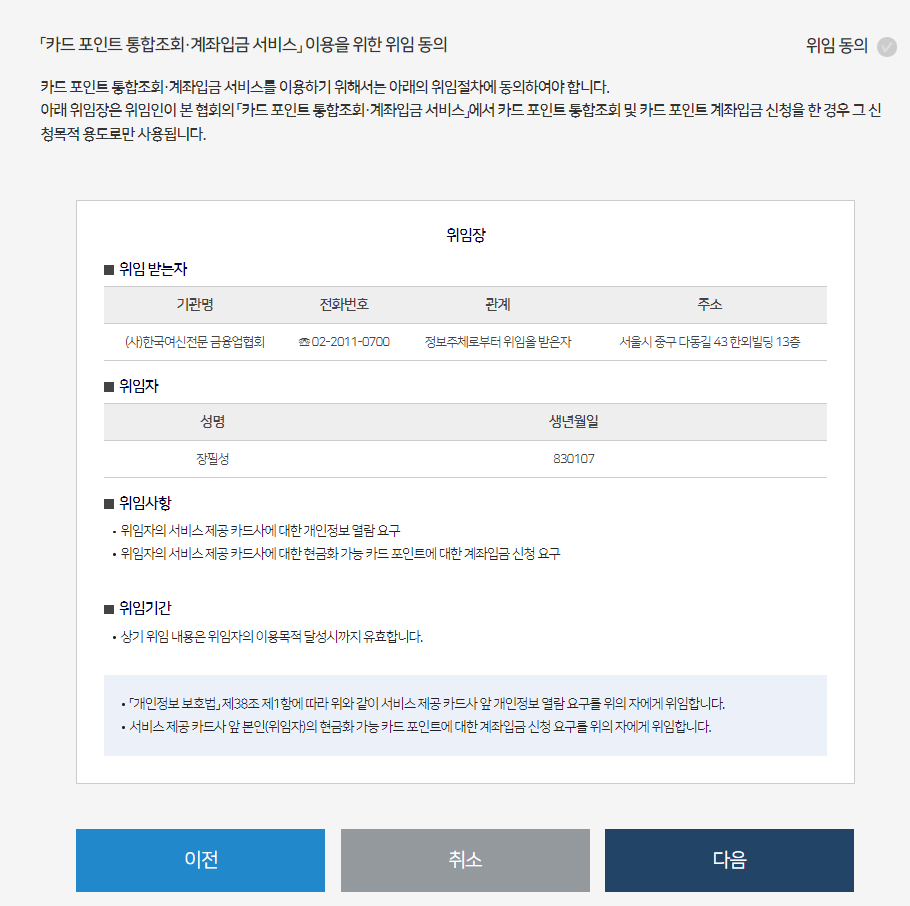 본인인증을 완료하시면 해당 서비스를 받기 위해 위임 동의를 해주셔야 진행이 가능합니다.