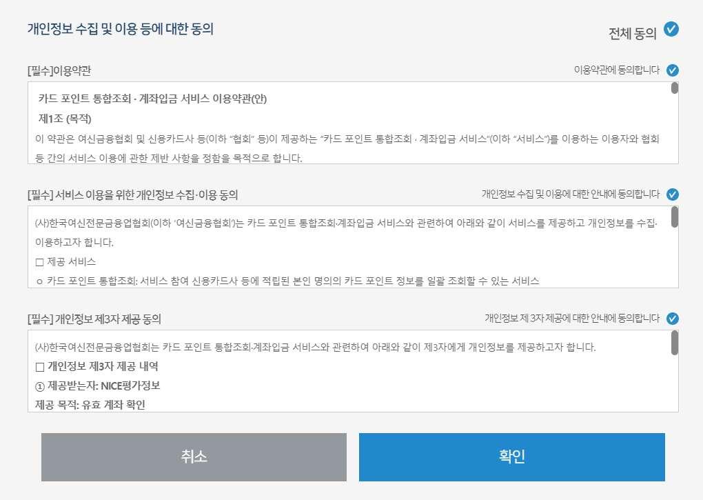 위임동의가 끝나면 아래와 같이 조회가 가능한 카드사 목록이 뜹니다.