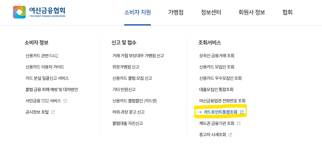 소비자 지원 > 카드포인트통합조회 메뉴로 이동합니다.