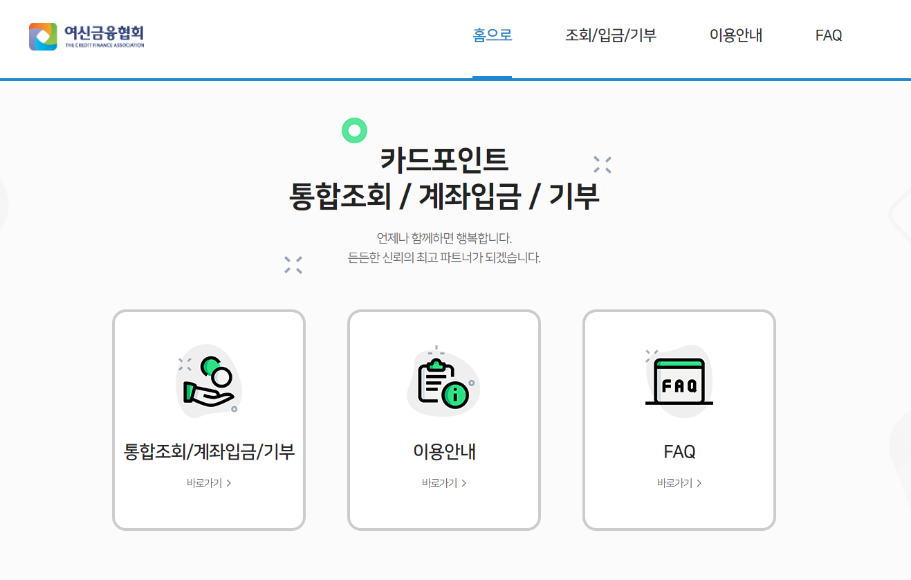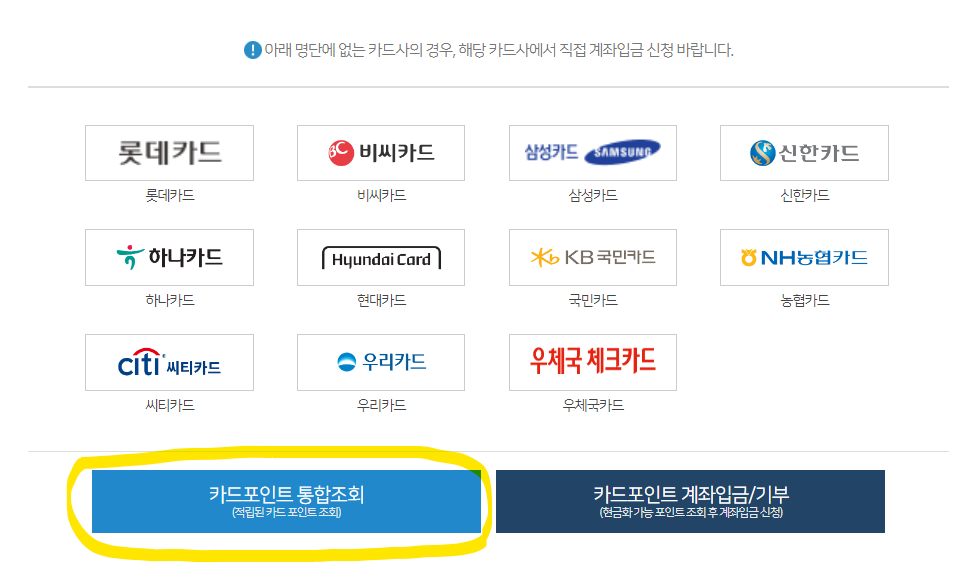 이동하시면 각 카드사의 카드포인트를 조회하고 계좌입금이나 기부를 할 수 있습니다.