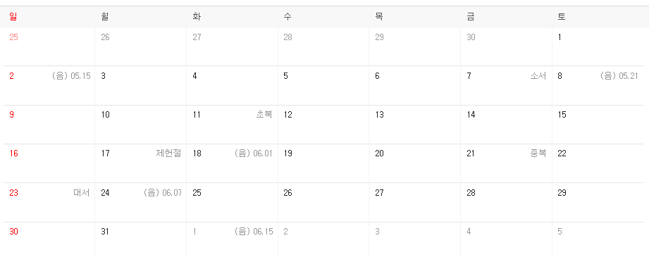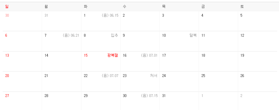 - 8월 15일 : 광복절 휴일