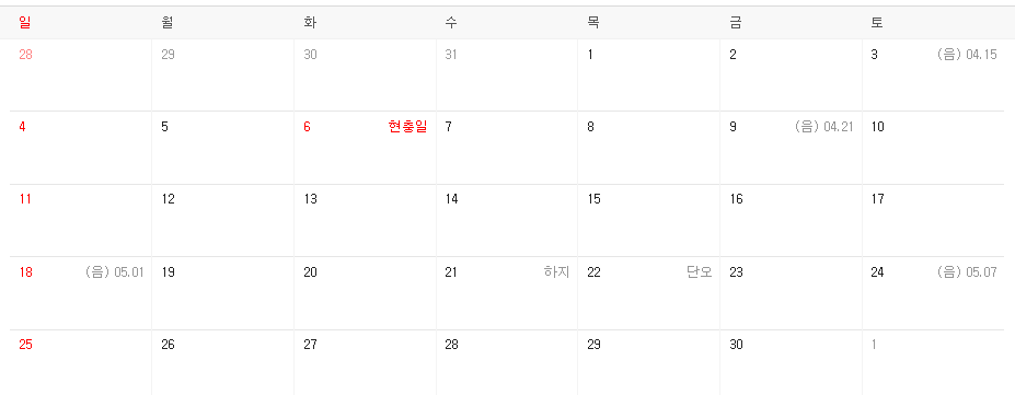 - 06월 03일 ~ 06월 06일 (4일) : 토, 일요일 + 징검다리 휴가(6/5) + 현충일