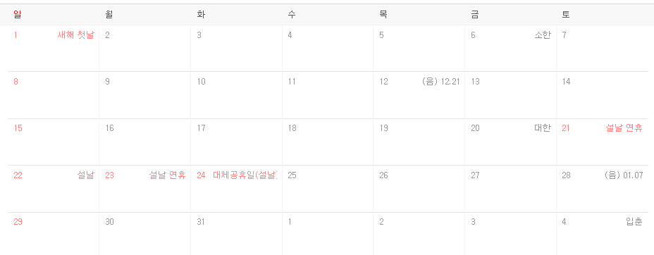 - 1월 1일 : 신년 새해인데 아쉽게도 일요일이네요.