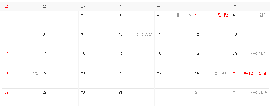 - 5월 27일 : 부처님 오신 날